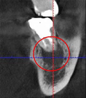 歯根の先端に膿が溜まる「根尖病巣」が起こる場合があり、そのようなときには「歯根切除術」で歯根の先端に溜まった膿を取り出す治療を行いますが、通常の根管治療では治療が困難な症例です。そこで、病巣付近の歯肉を切開して膿を取り出します。